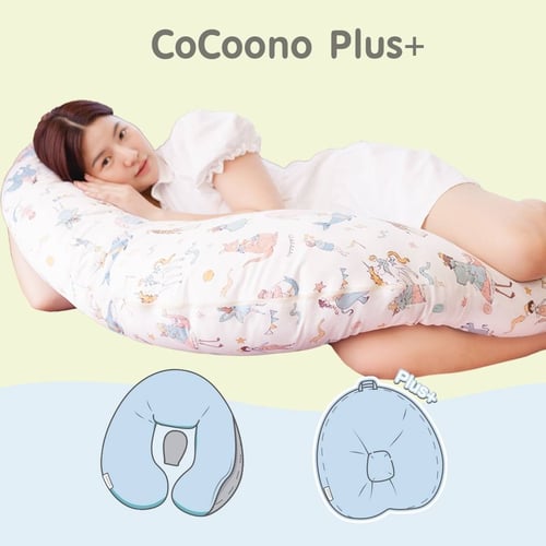 CoCoono plus+ upcycle provides extended usability as a maternity pillow, a backrest pillow, an armrest pillow, a nursing pillow, an anti-reflux pillow, and offers comfortable support for various needs. Each component of the pillow can be easily changed and washed, allowing for versatility.